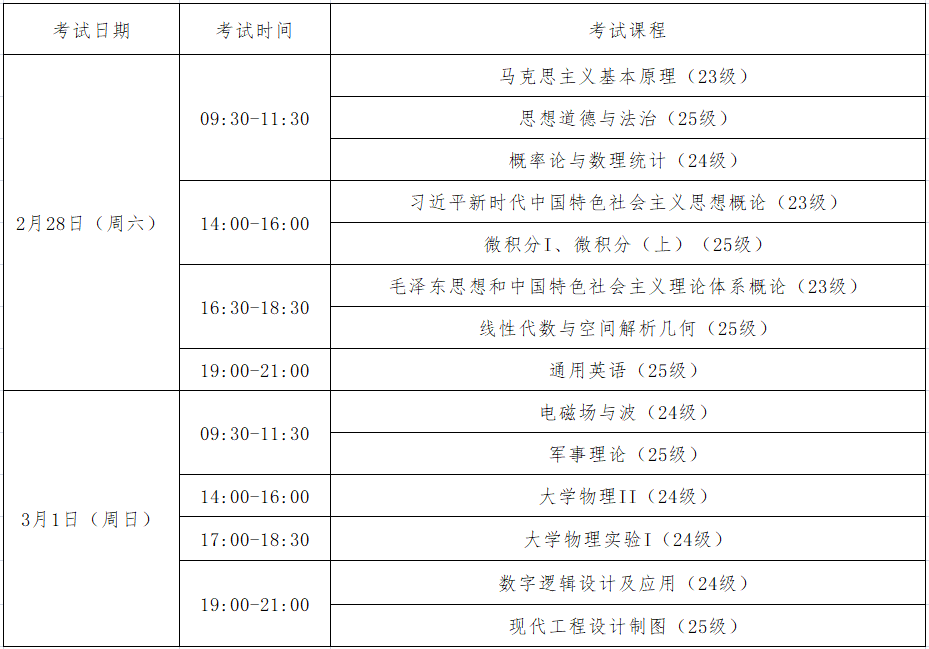 根据教学工作安排,大面积课程开学缓补考将于2026年2月28—3月1日进行,考试具体安排如下: