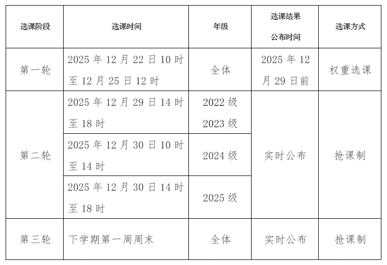 2025-2026-2学期本科生选课工作计划于2025年12月22日正式开始。本次选课分为三个轮次,其中本学期进行两轮选课,下学期开学后进行一轮退补选。具体安排如下: